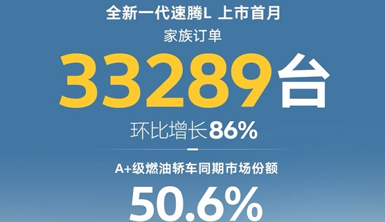 一汽-大众发布数据显示,全新一代速腾L上市首月,速腾家族销量达33289辆,环比增长86%,占据A+级燃油轿车同期市场份额50.6%,创历史新高。
