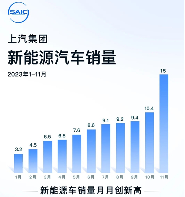 中国经济网12月4日讯(记者 郭跃)日前,上汽集团公布数据:11月,集团销售新能源汽车超过15万辆,以突破向上之势创历史月销新高。