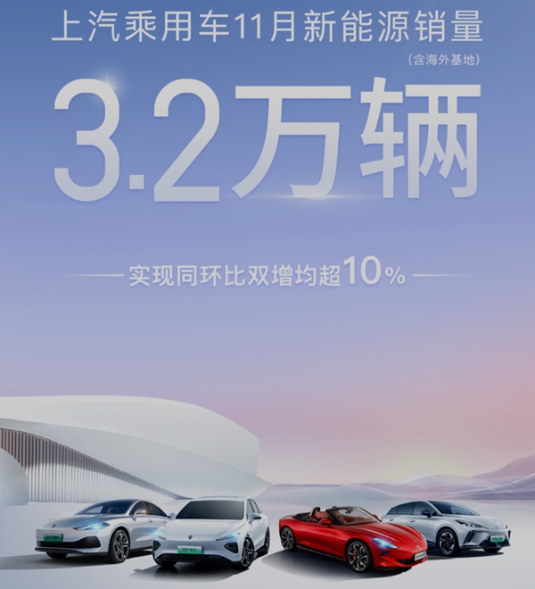 上汽乘用车紧随其后,11月共售出3.2万辆新能源汽车,同环比均增长超10%。值得注意的是,荣威D7家族与MG Cyberster于11月双双上市,为上汽乘用车新能源板块的持续增速,提供了助力。