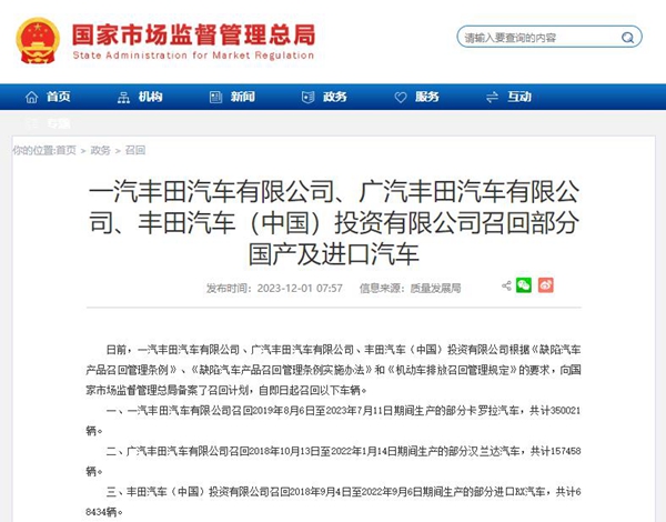 中国经济网12月5日讯(记者 郭跃)12月1日,国家市场监督管理总局发布了6起乘用车召回公告,涉及丰田、雷克萨斯、东风、宝马、福特5品牌在内的共计1071551辆乘用车将被召回。其中,丰田发布了3起公告,将共召回超102万辆丰田和雷克萨斯品牌汽车,占召回总量的95.19%。
