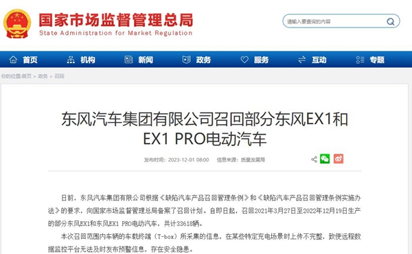 接下来,东风汽车将自即日起,召回共计33618辆东风EX1和东风EX1 PRO电动汽车。召回原因是车辆的车载终端(T-box)所采集的信息,在某些特定充电场景时上传不完整,致使远程数据监控平台无法及时发布预警信息,存在安全隐患。