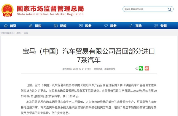 宝马也将自12月1日起,召回共计12197辆进口7系汽车。召回原因是车辆因供应商生产工艺调整,方向盘接地导线的螺栓孔未按规格生产,可能导致方向盘接地连接异常,方向盘离手检测系统无法识别驾驶员的手是否脱离方向盘,增加了开启车辆辅助驾驶功能后驾驶员及乘客的安全风险,存在安全隐患。