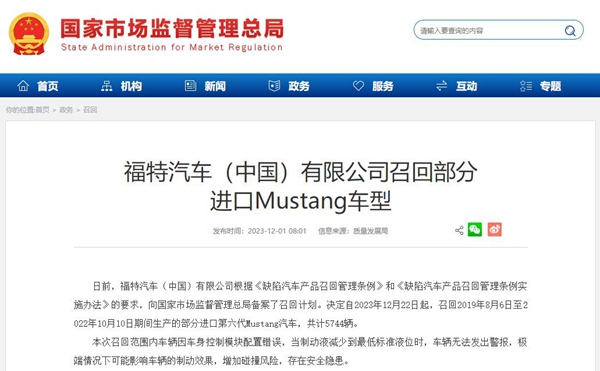 福特将自2023年12月22日起,召回共计5744辆进口第六代Mustang汽车。召回原因是车辆因车身控制模块配置错误,当制动液减少到最低标准液位时,车辆无法发出警报,极端情况下可能影响车辆的制动效果,增加碰撞风险,存在安全隐患。