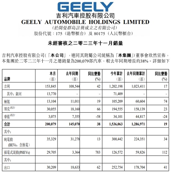 中国经济网12月5日讯(记者 姜智文)近日,吉利汽车控股有限公司发布数据显示,吉利集团11月销量再创新高达200079辆,同比增长约38%,环比增长约11%;其中,新能源汽车销售65034辆,连续四个月创新高。在此助推下,吉利集团前11个月累计销售1202198辆,同比增长17%。