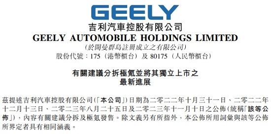 值得一提的是,极氪品牌独立上市(IPO)目前仍未尘埃落定。11月26日,吉利汽车控股有限公司发布声明显示,11月24日(纽约时间),极氪品牌就极氪发售向美国证交会公开提出申请。预计极氪发售将在市场条件许可时展开,并须由美国证交会宣告有关注册声明生效后“方可作实”。截至目前,尚未厘定极氪发售及出售的美国存托股票数目及金额。