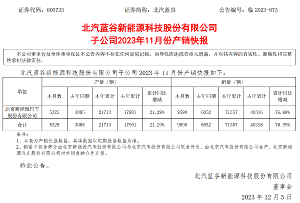 中国经济网北京12月6日讯(记者 陈梦宇) 北汽蓝谷(600733.SH)日前发布11月产销快报。数据显示,11月北汽蓝谷产销分别为5325辆和9590辆,去年同期分别为3085辆和6052辆;今年1-11月累计产销分别为21713辆和71357辆,同比分别增长21.29%和76.99%。