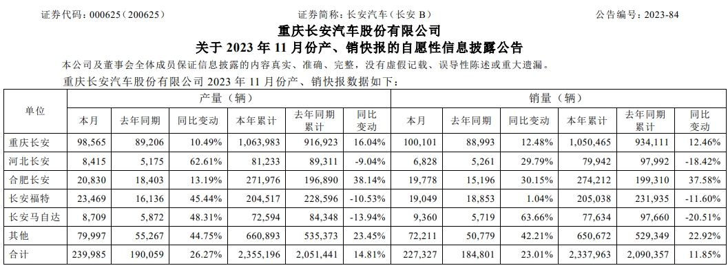 综合前11个月,长安汽车累计销售2337963辆,同比增长11.8%;自主品牌销量1933384辆,同比增加16.74%;自主乘用车销量1483033辆,同比增加21.77%;自主品牌海外销量220849辆,同比增加38.1%。