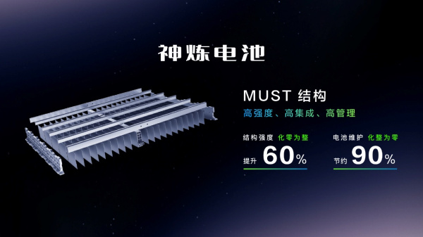 新车搭载“神炼电池”,首创不起火电芯“问顶技术”,不泄露、不起火、不爆炸;创新采用MUST结构,实现高集成、高强度、热管理等多功能合一,并通过车端+云端双BMS智能协同全天候安全巡检。得益于电池包的创新结构设计,在极端情况下造成的电池包壳体和电芯损伤,神炼电池能实现单个电芯的维修和替换,为用户节约90%的维修成本。新车整车高强钢占比76.4%,结合前端铝合金防撞梁设计、三横三纵式热成型超高强钢结构底盘,形成高效安全保障;同时配备ESC电子车身稳定系统、AUTO HOLD自动驻车、360高清全景影像、定速巡航等辅助配置,为用户安全出行保驾护航。