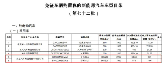 中国经济网北京12月13日讯(记者 张懿) 昨日,工信部发布《道路机动车辆生产企业及产品》(第377批)以及《免征车辆购置税的新能源汽车车型目录》(第七十二批)公告。产品型号为BJ7000的小米牌纯电动轿车正式进入工信部最新一批新车申报目录,车辆型号为BJ7000MBEVA1、BJ7000MBEVR2的小米SU7两版本车型亮相免征车辆购置税的新能源汽车车型目录,电池包容量、续航里程等参数曝光。