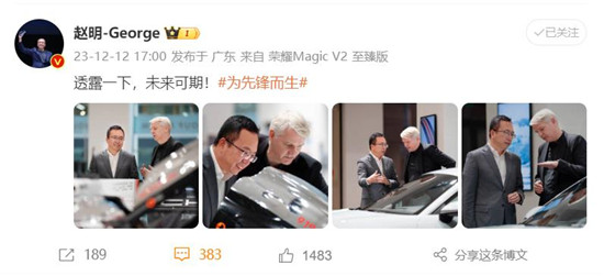 12月12日,荣耀终端有限公司CEO赵明在个人社交平台发布消息,带有多张与保时捷车型有关合影,并配文“透露一下,未来可期!”对此,网友纷纷猜测,荣耀或与保时捷在造车方面展开合作,并留言表示,“荣耀要造车了吗?”“盲猜这是保时捷的919?这是要和保时捷合作造车了吗?”“大众找小鹏,丰田找比亚迪,星盟找零跑,国外汽车厂商很多都找国内厂商合作造车,留给保时捷的已经不多了”……