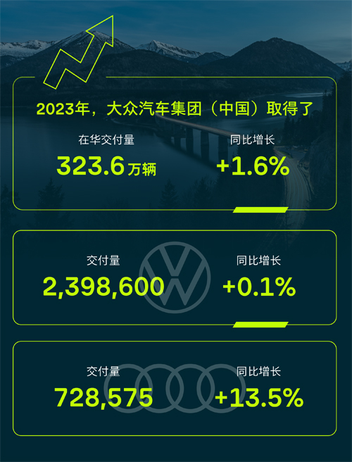 昨日(1月9日),大众汽车集团(中国)发布2023年销量数据,其各品牌全年在华累计交付车辆323.6万辆,同比增长1.6%。其中,奥迪品牌交付728575辆,同比增长13.5%;大众汽车品牌及捷达子品牌交付2398600辆,同比增长0.1%。