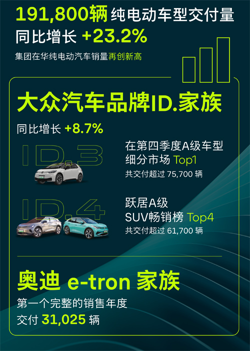 分车型来看,大众汽车品牌ID.3和ID.4以及奥迪e-tron系列车型市场表现出色。过去一年,ID.3车型交付量超75700辆,领跑紧凑级掀背车型细分市场。ID.4全年交付超过61700辆,在紧凑级SUV销量榜上跻身前五。共同推动大众汽车品牌,在去年四季度跻身中国纯电动汽车市场品牌销量榜前五。此外,在第一个完整的销售年度,奥迪e-tron家族车型交付量达到31025辆。