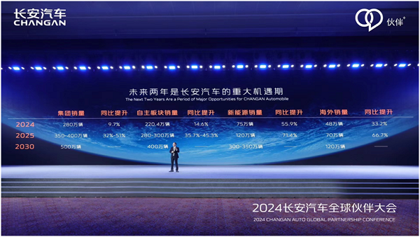 中国经济网1月18日讯(记者 陈梦宇)日前,长安汽车在2024全球伙伴大会上确立未来几年销量目标:2024年集团销量280万辆,其中自主板块220.4万辆,新能源75万辆,海外48万辆;2025年集团销量350万-400万辆,其中自主板块280万-300万辆,新能源120万辆,海外70万辆;到2030年,集团销量500万辆,其中自主板块400万辆,新能源300万-350万辆,海外120万辆,“成为世界一流汽车企业”。