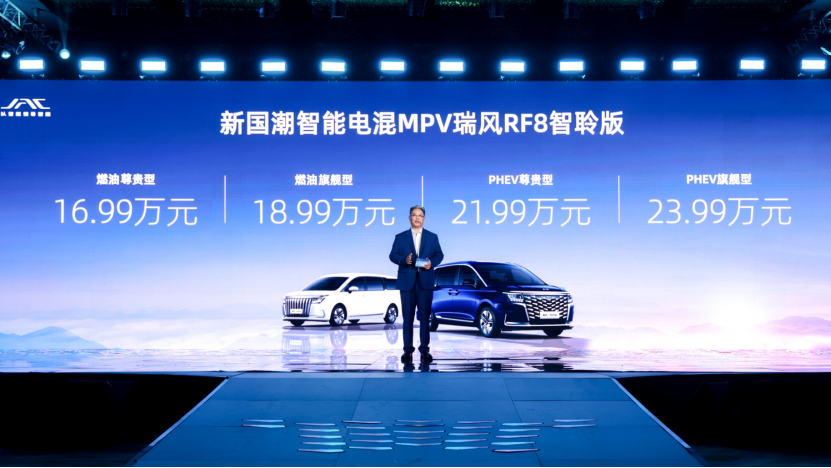 1月31日,江淮瑞风RF8电混MPV在广东东莞松山湖举行上市发布会,发布现场瑞风RF8智聆版以16.99-23.99万元的售价区间上市,同步开启配置升级礼、贴心金融礼、无忧换购礼、阖家畅享礼等多重政策,预订用户同时叠加全部的预售与上市权益。此外,从即日起到3月31日,所有大定用户在享受预售价的基础上现金直减 8888元。除了正式上市的智聆版,瑞风RF8鸿蒙版同步启动预售,预售价格为20.99~25.99万元,即刻预订享受订车无忧礼、用车无忧礼两大权益,并将于4月开启交付。