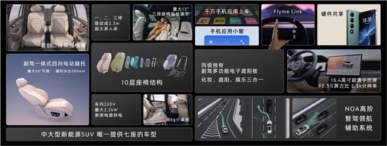 作为新能源中大型SUV中唯一提供七座版本的车型,新09EM-P拥有更多空间可变性,一二三排座椅可据需求实现联动放倒,在不同场景下提供最佳适配模式。“半月弯”悠享副驾采用同级领先的一体式四向电动腿托,可选装副驾多功能电子遮阳板,实现遮阳、化妆、娱乐功能三合一,实现超大角度旋转的无级调节,并支持副驾专属观影模式。前排四座均支持座椅加热、送风式无感通风和三档强度可调的8点式按摩。最新的Lynk OS N大屏版本配合15.4英寸超清中控屏,画质清晰度高达2.5K,车机运存升级至16G,运行更流畅,未来还将通过OTA实现Flyme Link及更多功能。