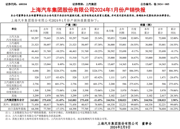 中国经济网2月18日讯(记者 郭跃)日前,上海汽车集团股份有限公司(证券代码:600104 证券简称:上汽集团)公布产销快报显示,2024年1月,上汽集团整车合计生产243883辆;批售244916辆,同比增长2.90%。另据上汽集团官方数据,1月,集团共零售整车超过45万辆,同比增长近50%。
