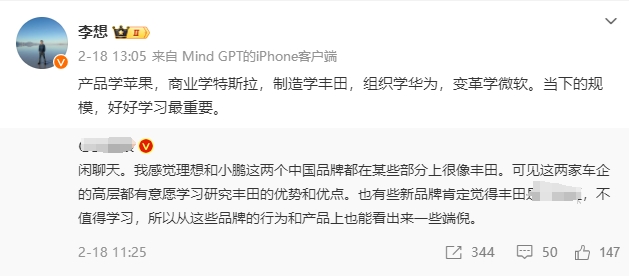 中国经济网2月20日讯(记者 姜智文)2月18日,理想汽车CEO李想表示,“产品学苹果,商业学特斯拉,制造学丰田,组织学华为,变革学微软。当下的规模,好好学习最重要。”
