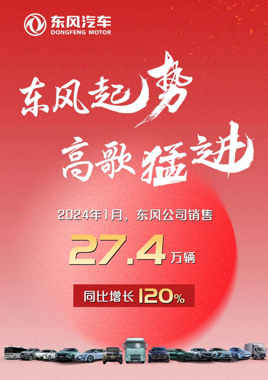 “2024年1月,东风汽车集团共销售27.4万辆新车,同比增长120%,实现开门红。”