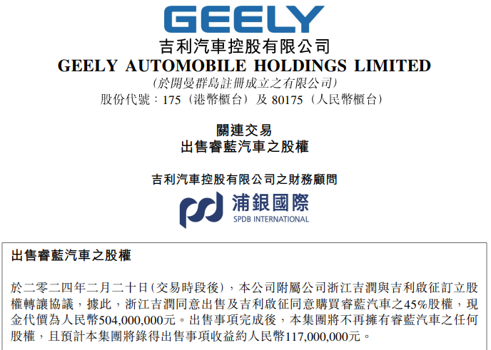 中国经济网2月22日讯(记者 姜智文)2月20日,吉利汽车控股有限公司发布公告称,公司附属公司浙江吉润同意出售及吉利启征同意购买睿蓝汽车45%股权,现金代价为5.04亿元人民币。