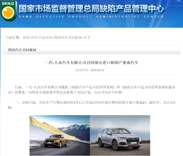 另有313辆进口奥迪Q7、Q8的召回原因是车辆由于驾驶员座椅侧面安全气囊没有正确安装到座椅靠背框架内,在车辆发生碰撞事故时,座椅侧面安全气囊可能无法按照预定位置展开,增加车辆乘员受伤风险,存在安全隐患。对此,一汽-大众汽车有限公司将委托奥迪授权经销商为召回范围内的车辆免费检查驾驶员座椅侧面安全气囊,如侧面安全气囊没有安装到位,将重新安装固定,以消除安全隐患。