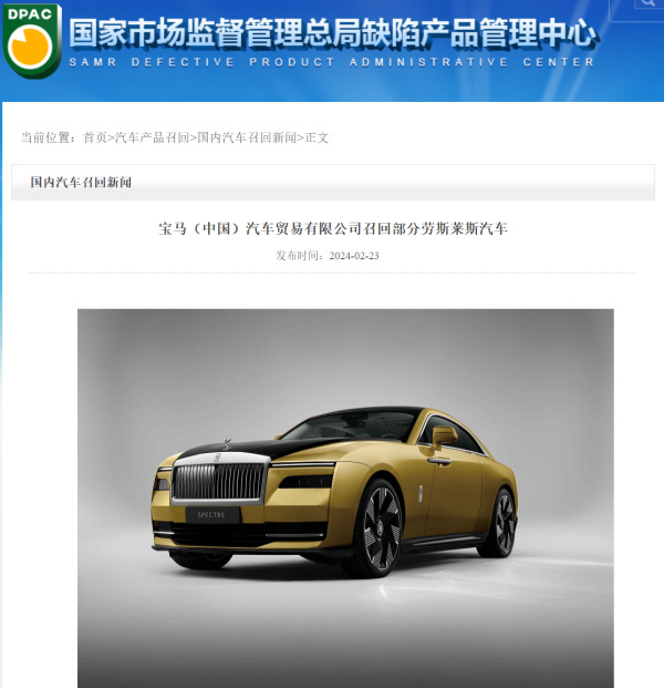 劳斯莱斯将自公告日起,召回15辆闪灵汽车。召回原因是车辆因前部驱动电机接地保护线的连接器孔位处可能残留绝缘胶,导致该位置电阻增加,接地连接不良,极端情况下存在发热风险。在特定电气故障发生时,可能会增加维修人员在检修车辆过程中的受伤风险,存在安全隐患。