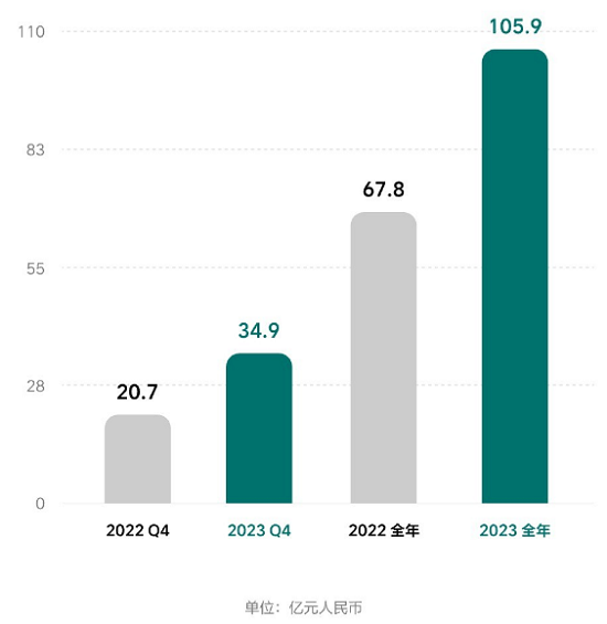在研发领域,理想汽车2023年四季度费用为34.9亿元,同比增长68.6%;全年费用为105.9亿元,同比增长56.1%。理想汽车表示,“坚定长期投入研发,坚持双能领域核心技术自研。”