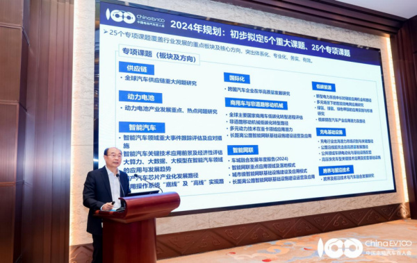 会议期间,中国电动汽车百人会宣布中国电动汽车百人会论坛(2024)将于3月15日至3月17日在北京召开。中国电动汽车百人会副秘书长师建华做了2023年研究情况介绍与2024年研究和活动规划发布。
