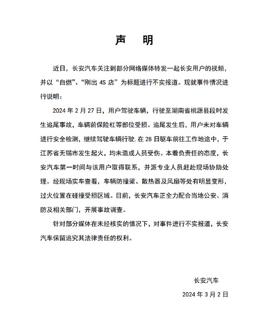 长安汽车表示,2024年2月27日,用户驾驶车辆,行驶至湖南省桃源县段时发生追尾事故,车辆前保险杠等部位受损。追尾发生后,用户未对车辆进行安全检测,继续驾驶车辆行驶,在 28日驱车前往工作地途中,于江苏省无锡市发生起火,均未造成人员受伤。