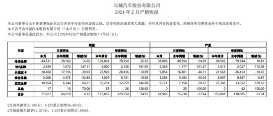 长城汽车2024年2月产销快报