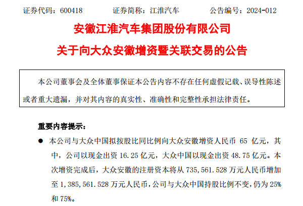 中国经济网3月13日讯(记者 陈梦宇) 昨日,江淮汽车(600418.SH)发布公告称,大众汽车(安徽)有限公司(以下简称“大众安徽”)因经营发展需要,拟增加 65 亿元的注册资本,拟由江淮汽车和大众汽车(中国)投资有限公司(以下简称“大众中国”)同比例进行现金认购,其中江淮汽车拟认购大众安徽16.25亿元的注册资本,大众中国拟认购大众安徽48.75亿元注册资本。