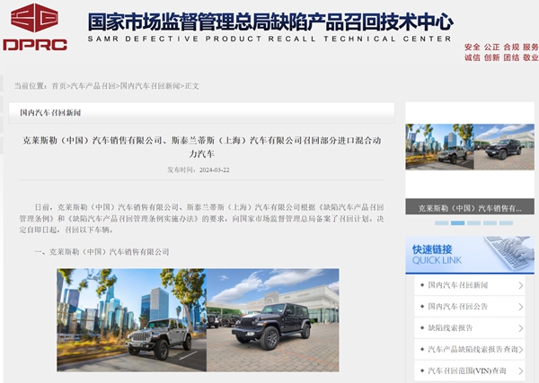 其中,4730辆进口2.0T 4xe Sahara四门版牧马人混合动力汽车、392辆进口2.0T 4xe Rubicon四门版牧马人混合动力汽车、3836辆进口全新大切诺基4xe汽车的召回原因是,车辆由于混合动力控制模块软件错误,可能导致除霜和除雾系统无法工作,极端情况下降低驾驶员的能见度,增加车辆发生碰撞的风险,存在安全隐患。