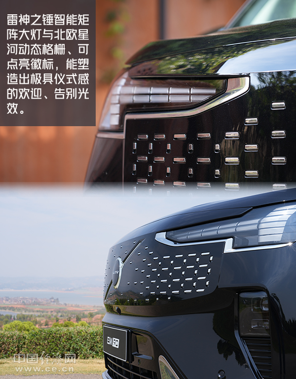 聚焦产品本身,设计层面,将庄重典雅东方元素与斯堪的纳维亚设计哲学完美融合的EM90,已然具备收获高净值人群青睐的先天条件。从车头看去,极具设计创意的北欧星河动态格栅点亮后,宛如将满天星斗“尽收囊中”;共115颗“星斗”还营造出了不对称的自然之美。雷神之锤智能矩阵大灯与动态格栅、可点亮徽标,更塑造出了极具仪式感的欢迎、告别光效。