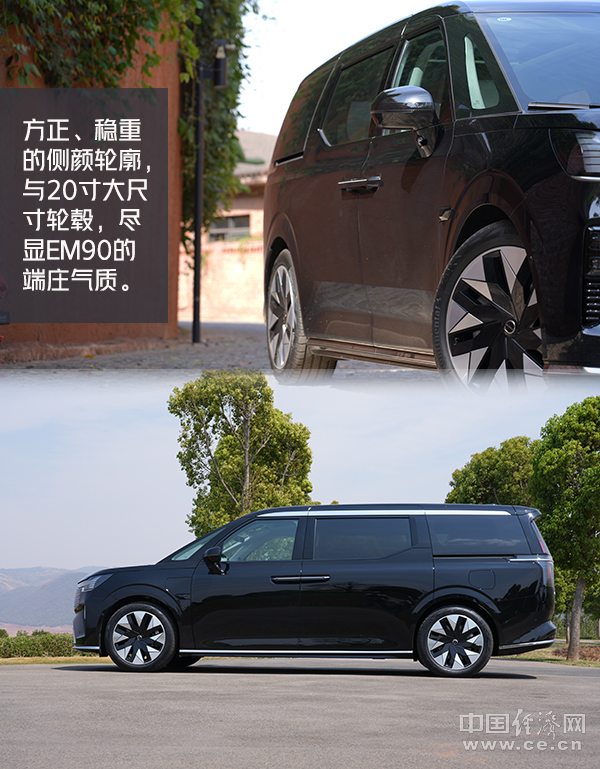 方正、稳重的侧颜轮廓,则尽显EM90的端庄气质。20寸的大尺寸轮毂,也为EM90的踏实可靠再添一笔。