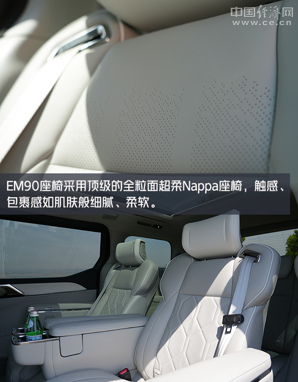 举例来看,EM90座椅采用顶级的全粒面超柔Nappa座椅,不仅环保无污染,触感、包裹感更是如肌肤般细腻、柔软。