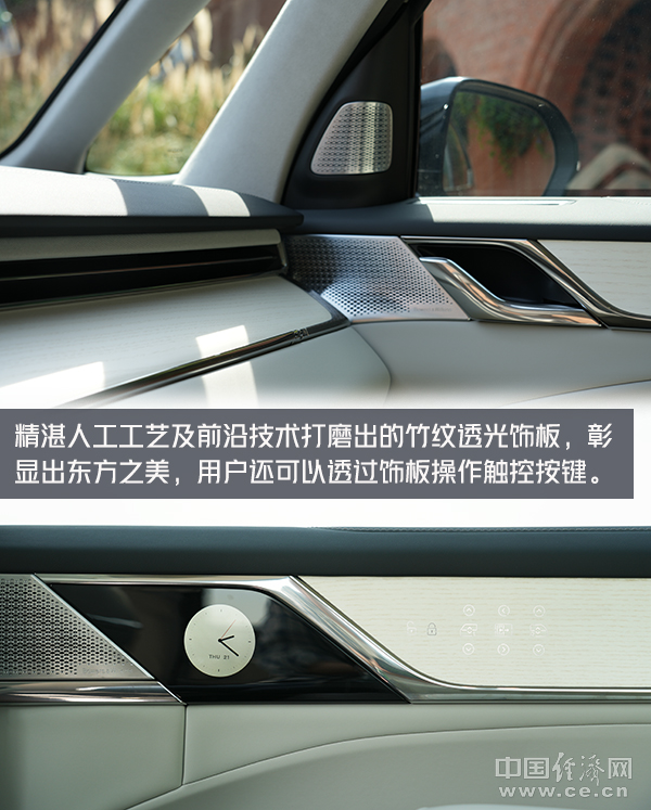 EM90车内每一处近乎极致的设计、做工、材质细节,都更有可能成为打动高净值客户的关键点。如利用精湛人工工艺以及前沿技术打磨出的竹纹透光饰板,不仅彰显出自然风光与东方之美,选材于天然岑木或天然桦木更凸显了其地位。更值得注意的是,源自于纯手工打造的竹纹透光饰板厚度均匀且仅有0.5毫米,让用户可以透过饰板即操作触控按键。