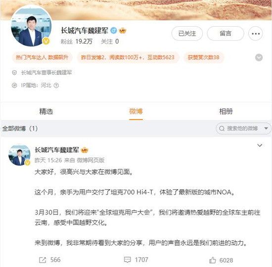 中国经济网北京3月28日讯(记者 张懿) “大家好,很高兴与大家在微博见面。”3月26日下午,长城汽车董事长魏建军于个人微博平台发布了首条消息。他表示,“这个月,亲手为用户交付了坦克700 Hi4-T,体验了最新版的城市NOA。3月30日,我们将迎来‘全球坦克用户大会’,我们将邀请热爱越野的全球车主前往云南,感受中国越野文化。”魏建军最后表示,“来到微博,我非常期待看到大家的分享,用户的声音永远是我们前进的动力。”