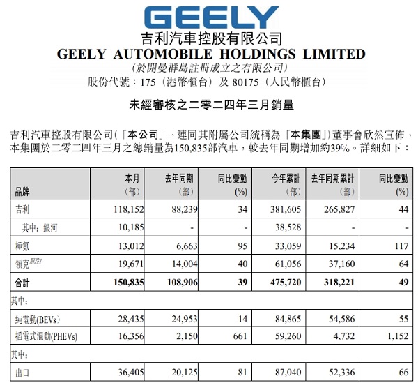 此外,在吉利银河、几何和极氪品牌等带动下,吉利新能源汽车3月销量为4.48万辆,同比增长约65%,占比总销量约30%;一季度销量为14.41万辆,其中插电式混动车型销量5.93万辆,同比暴增11.5倍。