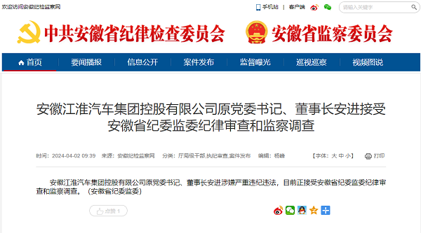 中国经济网4月2日讯(记者 陈梦宇) 据安徽省纪委监委官网消息,安徽江淮汽车集团控股有限公司原党委书记、董事长安进涉嫌严重违纪违法,目前正接受安徽省纪委监委纪律审查和监察调查。