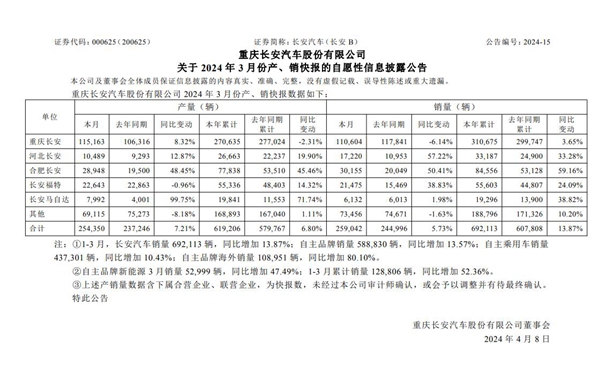中国经济网北京4月9日讯(记者 姜智文)昨日,长安汽车发布产销快报显示,长安汽车3月销量25.9万辆,同比增长5.7%,环比大增69.61%。综合一季度数据,长安汽车累计销量达69.21万辆,同比增长13.9%。