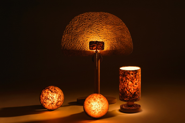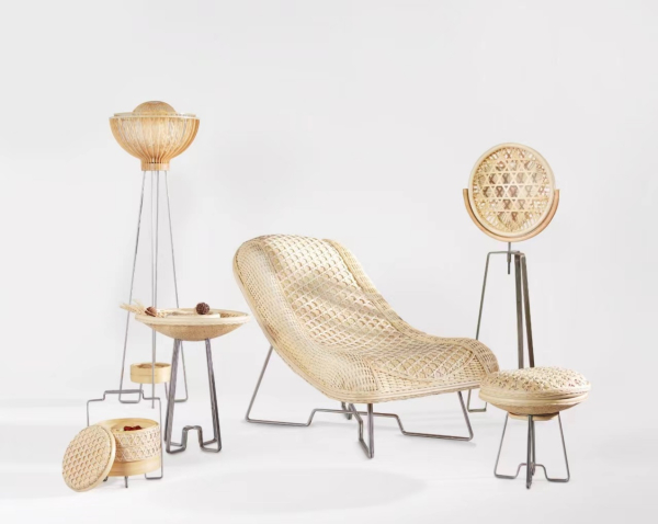 例如这组名为“鱼跃-未来漆器”的系列灯具,采用高粱杆、玉米叶和玉米穗等天然绿色的生物质材料做成纸浆,将手工纸造纸工艺与大漆工艺创新性结合,灯具设计采用模块化,易拆卸组合、原材料来自大自然,回归大自然而无任何污染。名为“温故知新”系列竹编器物同样利用“就地取材、就地取艺、就地传承”设计原则,唤起人们对过去生活的温情与回忆,同时又回应了人们对质朴生活追求的需要。