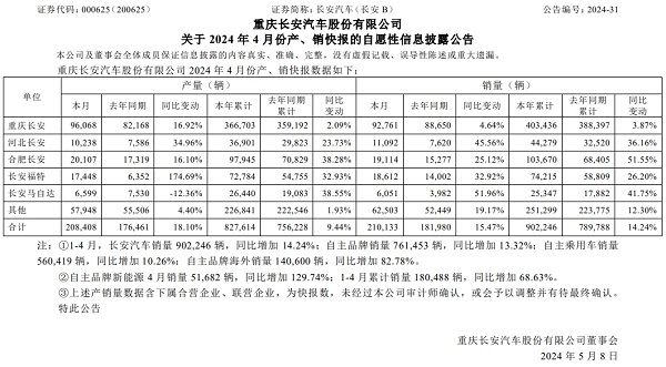 综合1-4月,长安汽车销量902246辆,同比增加14.24%;自主品牌销量761453辆,同比增加13.32%;自主乘用车销量560419辆,同比增加10.26%;自主品牌海外销量140600辆,同比增加82.78%;自主品牌新能源销量达180488辆,同比增长68.63%。