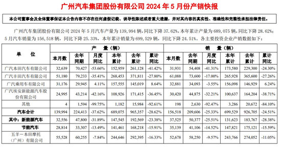 中国经济网北京6月11日讯(记者 张懿) 6月7日晚间,广汽集团发布最新产销快报显示,5月全集团汽车终端销量156518辆,同比下降25.33%;今年前五个月累计销量699529辆,同比下降24.51%。除广汽乘用车,广汽本田、广汽丰田、广汽埃安今年累计销量均呈现两位数下滑,降幅分别达到24.3%、27.26%和38.71%。