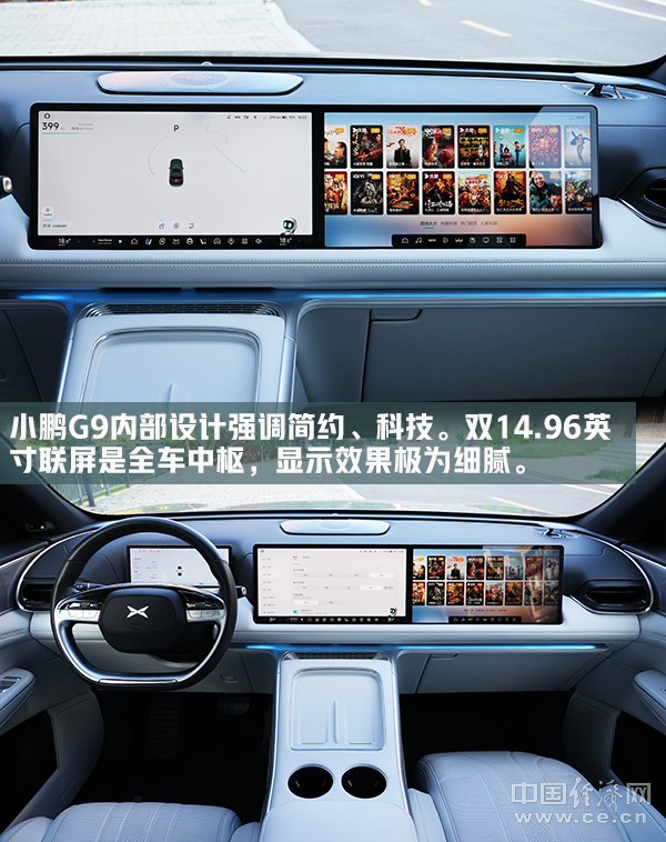 小鹏G9的内部设计强调简约、突出科技。由14.96英寸中控屏与14.96英寸副驾娱乐屏组成的双联屏是全车的信息、操控中枢,2K的分辨率令其显示效果极为细腻。其中,车内几乎所有手动操作都需要通过中控屏触摸操作完成,此外。中控区域几乎没有实体按键,实用性还是略有不及;当然也可以通过呼唤“小P”完成各种操作,稍加熟悉也会更加得心应手、也更加安全。而副驾驶的娱乐屏在当下“屏幕当道”的时代中虽算不上创新,但绝对是最能为旅途加分的配置之一。