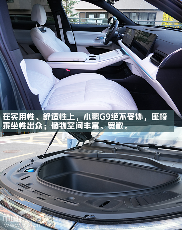 在设计上追求极致的前卫,在实用性、舒适性上,小鹏G9则是绝不妥协。前排宽大厚实的座椅,乘坐性出众,通风、加热自然一应俱全,按摩功能力度更是记者体验过产品中最“给力”的,甚至能媲美真人手感,绝非噱头。同时,宽大、充足的储物空间也不会令随身物品较多的乘客无所适从;大件物品则可以放置到标准容积为660升的后备箱,或是容积可观的前备箱中。