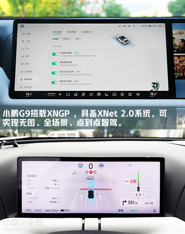 小鹏G9搭载XNGP 智能辅助驾驶系统,具备XNet 2.0深度视觉感知系统,可以实现无图、全场景、点到点的智驾功能。记者实际体验中,通过视频学习开通XNGP功能后,只需规划好导航路径,再拨动两下怀挡拨杆就能开启辅助驾驶功能,在城市驾驶中,XNGP已展现出颇为人性化的水平,红绿灯启停、自动变道、自动跟车、自动泊车等功能都非常丝滑;在高速道路行驶中,XNGP表现更犹如“老司机”,自动上下、盘旋匝道,自动超车等动作稳健、果断,不禁让人赞叹科技的进化之快。