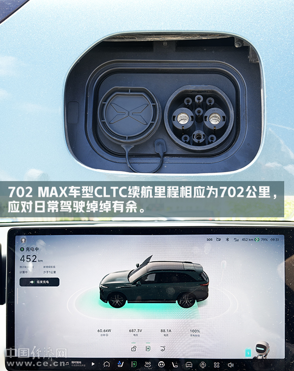 此外,对于纯电车型,续航里程仍然是消费者最为关注的核心数据之一,记者本次试驾的702 MAX车型CLTC续航里程相应为702公里,试驾中的实际表显续航里程也可达到约600公里,应对日常驾驶绰绰有余。即使长途驾驶也无需担心,小鹏G9标配全域800V高压SiC平台和支持超快充的3C电池,充电功率可达315千瓦,最短仅需20分钟即可完成从10%到80%的电量补充。(视频/图/文 中国经济网记者 郭跃)