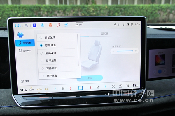 前排主副驾座椅集成12向电动可调(座椅8向、腰托4向)、座椅记忆、座椅通风、座椅加热等功能于一身;并配备10点按摩系统,支持8种模式、3种强度、5种时长选择。