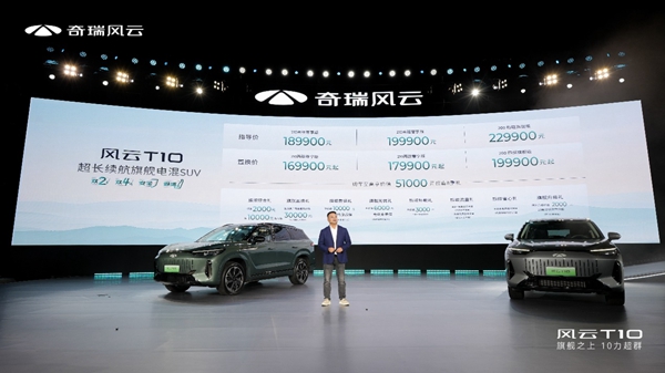中国经济网7月26日讯(记者 郭跃)昨晚,奇瑞风云序列超长续航旗舰电混SUV——风云T10正式上市。新车共推出3款车型,包括210尊享版18.99万元、210奢享版19.99万元、200四驱旗舰版22.99万元。