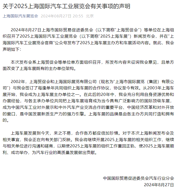 声明还表示,“对于本次上海新闻发布会及相关事宜,我会正在向有关部门反映。我会将继续开展2025上海车展的相关组织工作,继续与相关单位进行沟通和磋商,以期使2025上海车展的组织工作重回正轨。”