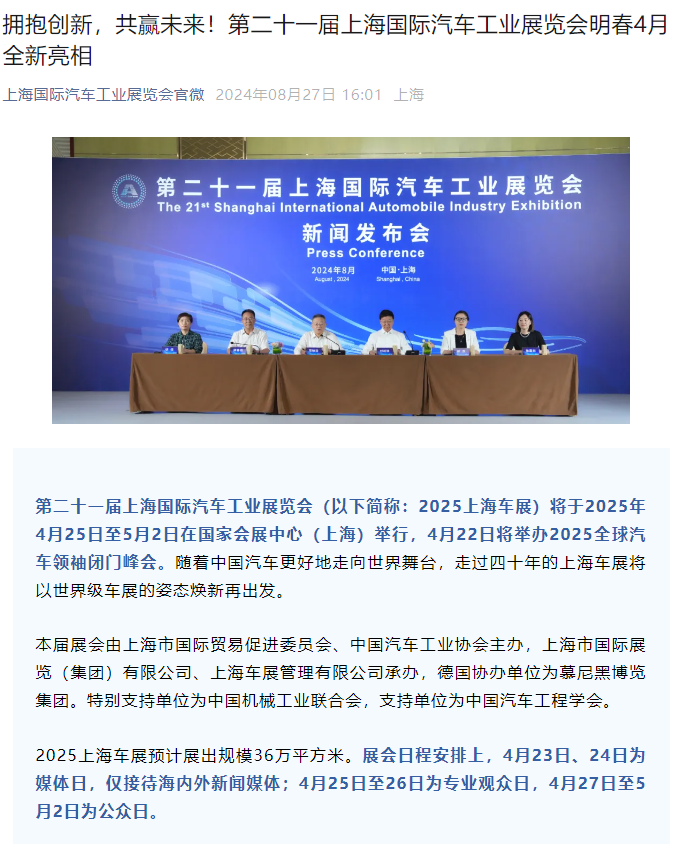 昨日,上海市国际贸易促进委员会(简称:上海贸促会)等单位在上海组织召开了2025上海国际汽车工业展览会(简称:2025上海车展)新闻发布会,并在“上海国际汽车工业展览会官微”公众号发布了2025上海车展主办方和车展活动内容。